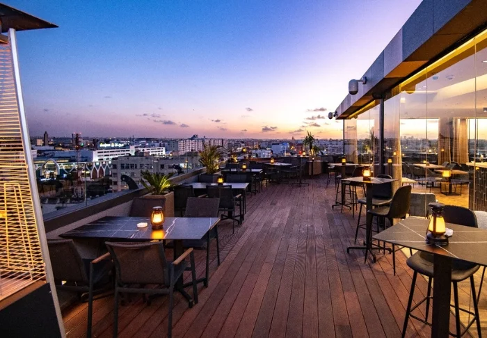 Du bør også unne deg en tur opp på hotellets takterrasse, som spesielt ved solnedgang byr på fantastisk utsikt over byen.