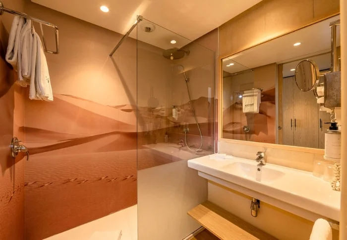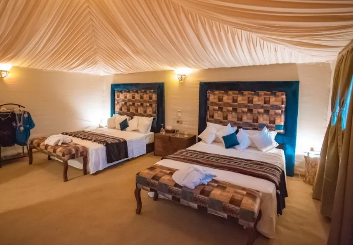 Du overnatter i et luksuriøst telt med eget bad med dusj og badefasiliteter. Teltene har aircondition og – avhengig av sesong – oppvarming, så komforten er på topp, selv om temperaturen ute i ørkenen kan variere en del.