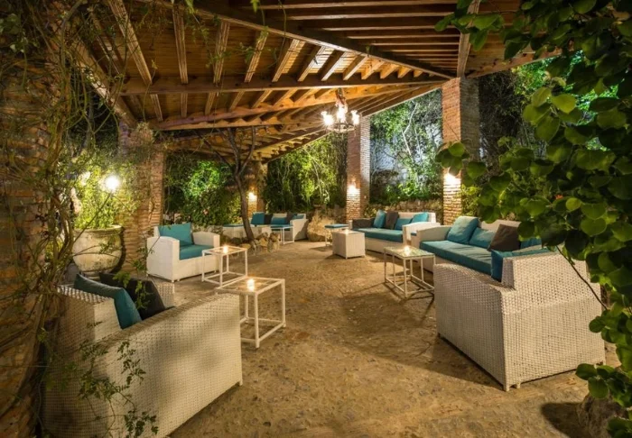 Bassenget ligger ved en tilhørende gårdshage/terrasse, hvor det finnes solsenger, stoler og bord. Det er det perfekte stedet for å slappe av i ettermiddagssolen, og måltidene nytes i riadens hyggelige restaurant.
