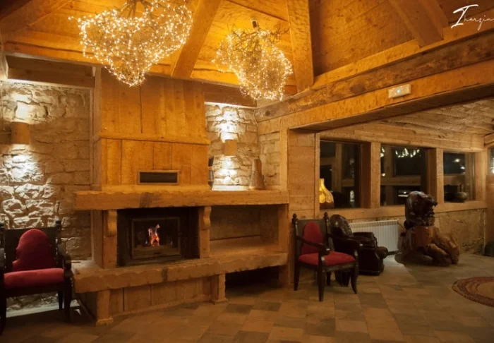 Maten serveres i den rustikke restauranten, og ofte tennes peisen i baren, hvorfra du kan nyte utsikten til det vakre landskapet rundt deg. Når været tillater det, dekkes det opp ute på terrassen.