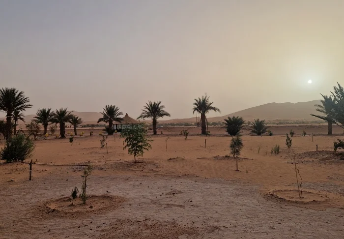 Fra din egen terrasse har du utsikt mot de berømte sanddynene Erg Chebbi. Seint på dagen, når solen går ned bak dynene, oppstår en helt spesiell stemning, der lydene nærmest fortettes i det svinnende lyset.