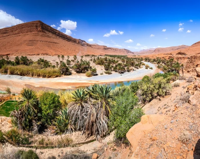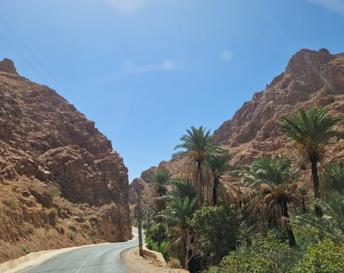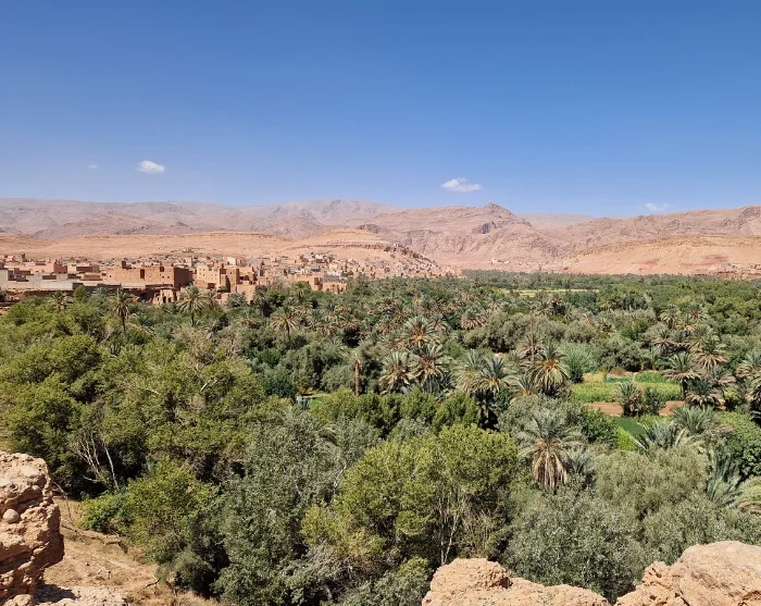 Deretter fortsetter du gjennom et fascinerende landskap av stein og røffe klipper. Plutselig skjer forvandlingen: En oase åpenbarer seg midt i det tørre landskapet. Grønne palmer, små åkre og irrigasjonskanaler sprer seg i bunnen av dalen. Den første oasen du møter er Skoura, hvor gamle kasbaher og leirhus ligger spredt mellom palmene.