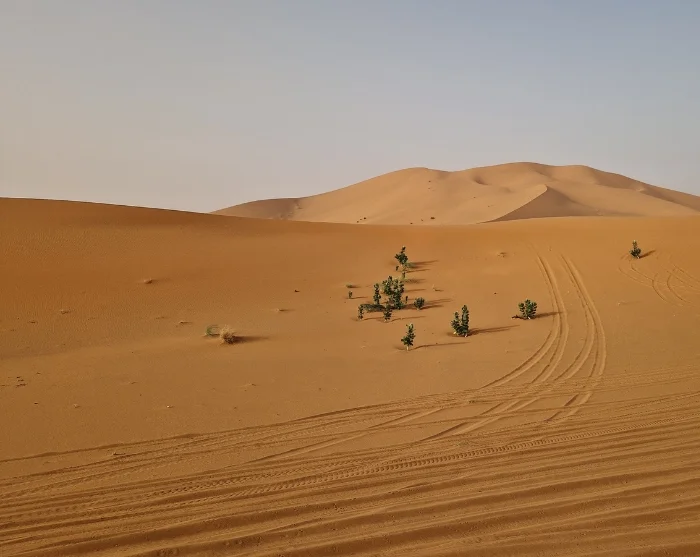 Jo nærmere du kommer Merzouga, desto mer dominerende blir ørkenen. Palmer og oaser forsvinner, og sanddyner reiser seg i horisonten. Til slutt møter du de imponerende Erg Chebbi-dynene: høye, bølgende sandfjell som gløder i solnedgangen, og som er preget av sine dype oransje nyanser og myke former.