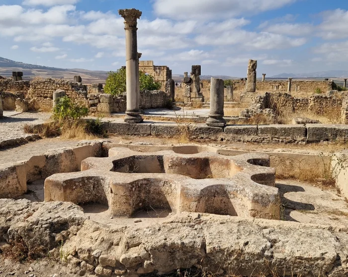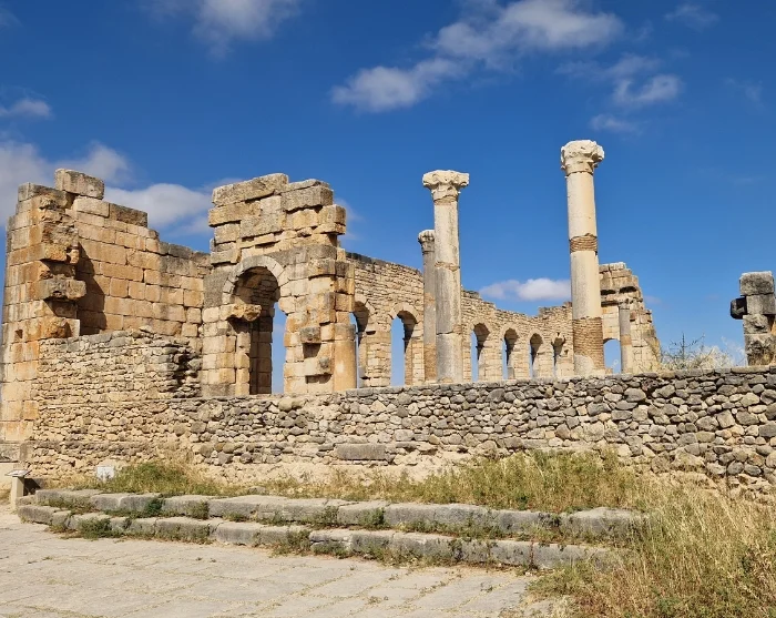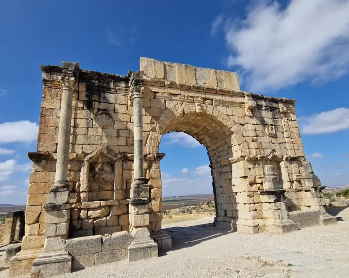Fra Meknès går reisen videre til de imponerende romerske ruinene Volubilis, som ligger drøyt 30 km nord for Meknès. Når du står ved «Triumfbuen» i den gamle romerske byen, omgitt av søyler og eldgamle mosaikker, og nyter utsikten over grønne olivenlunder og frodige jorder, ja, da er det lett å forstå hvorfor nettopp dette stedet ble valgt av romerne.