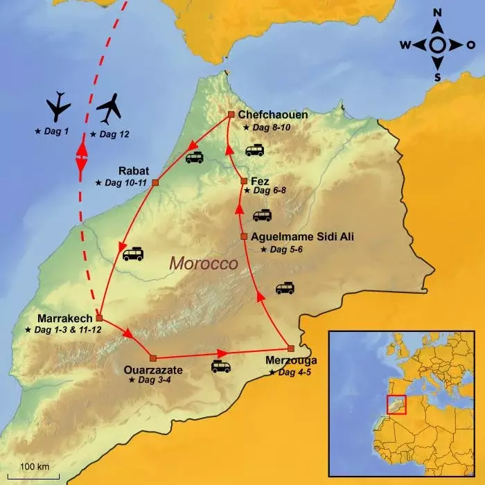 Reisen starter i livlige Marrakech, hvor du deretter krysser Atlasfjellene via det spektakulære fjellovergangen Tizi n’Tichka, og opplever karavanebyen Aït-Ben-Haddou og filmsettet i Ouarzazate.