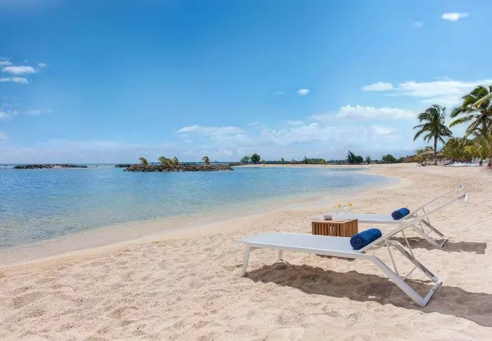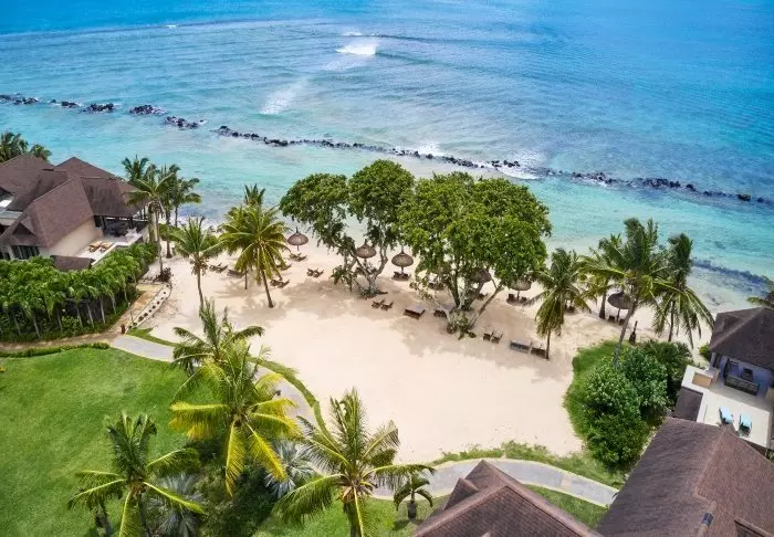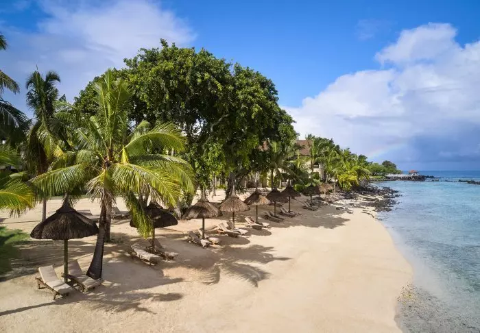 Hotellet ligger på en av Mauritius’ vakreste strender, Palmar-stranden. Her snakker vi kritthvit sand og turkis sjø.
