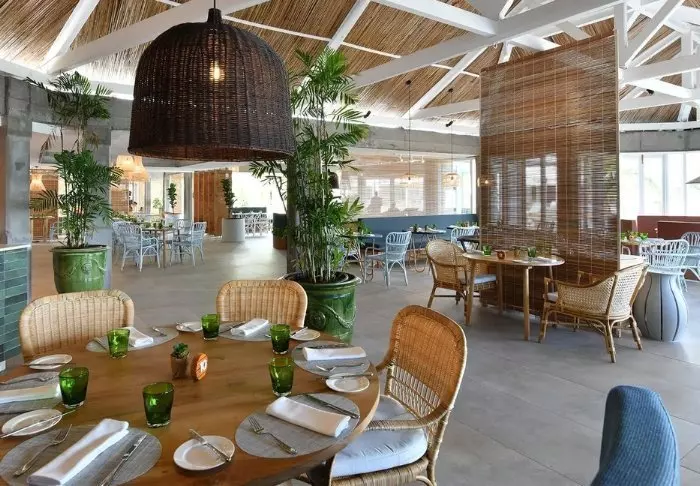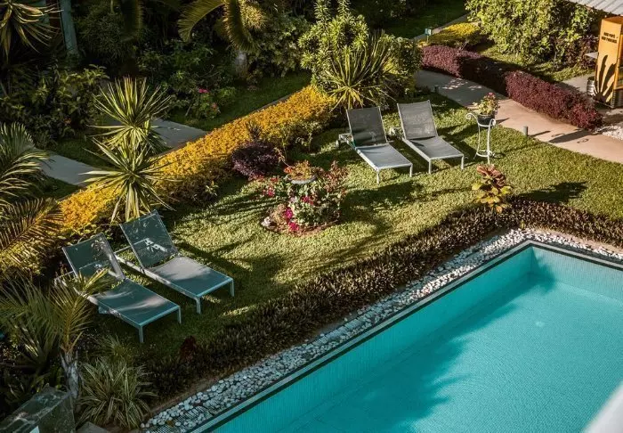 I midten av hotellet finner du bassenget og restauranten, som er omgitt av tropisk vegetasjon. Bassenget er ikke stort, men det gjør ikke så mye: Utenfor komplekset ligger den vakreste hvite stranden som fører ut i det turkise havet.