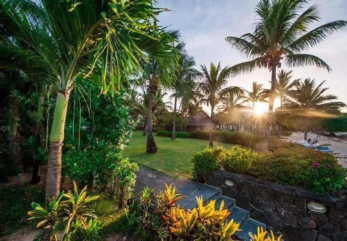 Selve stranden ligger i enden av den store, frodige hagen der rommene ligger.