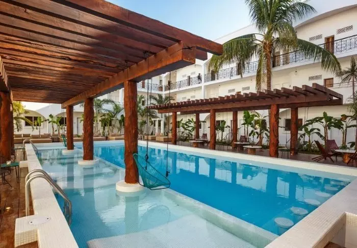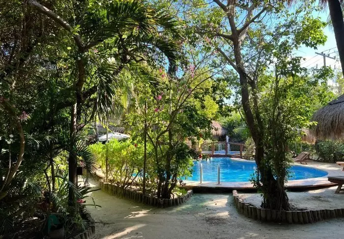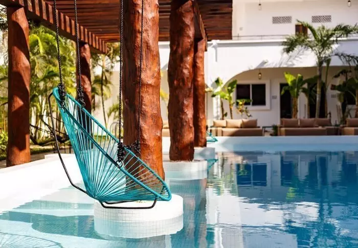 I forlengelsen av hovedrestauranten ligger svømmebassenget og den tilstøtende bassengbaren, der du kan svømme for å få noe kaldt å drikke uten å måtte gå ut av bassenget først. Det er både solsenger rundt bassenget og i hotellets hage, der du kan lese en god bok i skyggen av et palmetre. Hvis du krysser den lille sandveien, havner du på Holbox’ berømte strand med asurblått vann og en varm havbris. Her er det også solsenger for gratis bruk, og du kan selvfølgelig bestille mat og drikke som skal leveres her, for å skjemme deg bort litt ekstra.