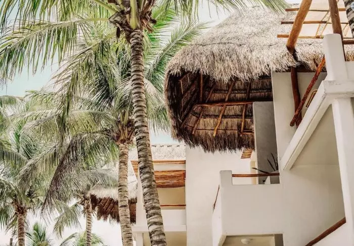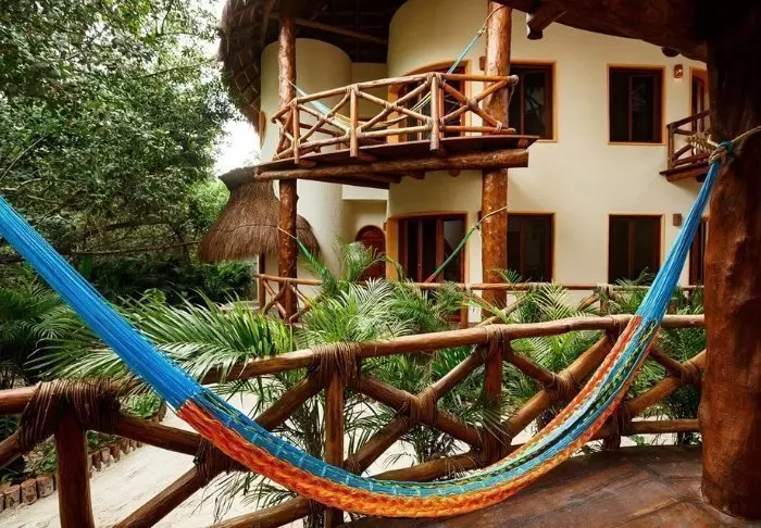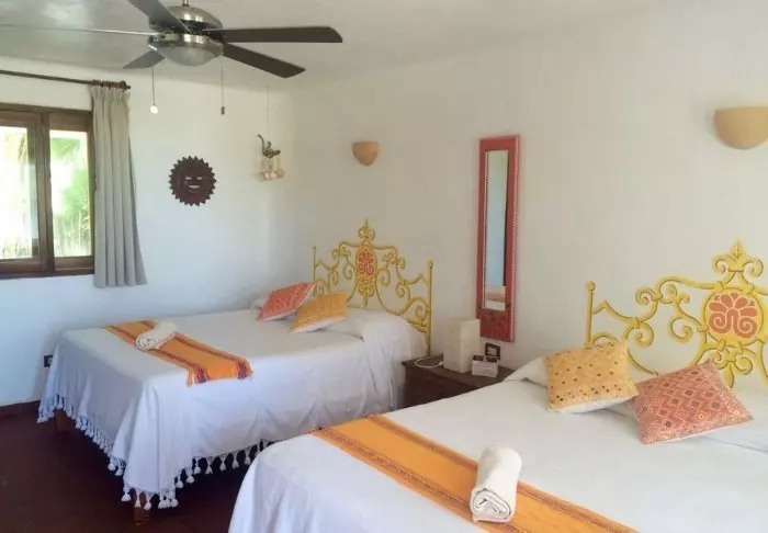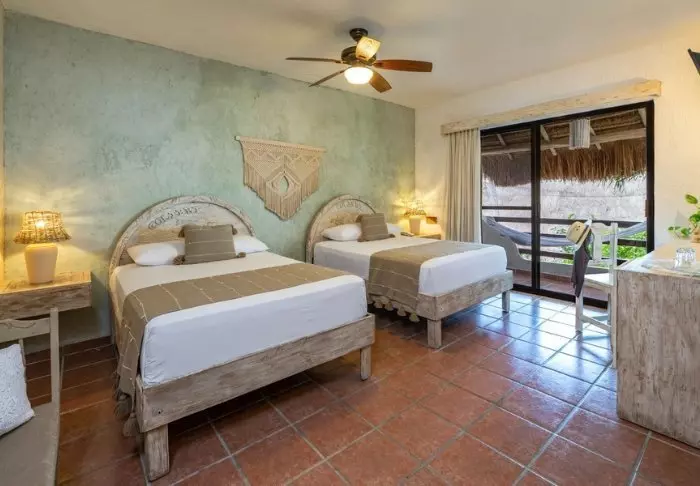 Du bor i sjarmerende hytter som er bygd av naturlige materialer, inkludert med et tak laget av tørkede palmeblader. Rommene er romslige og elegant innredet med en harmonisk blanding av lyse farger, fargerike meksikanske tepper og puter, samt vakre mørke tregulv og møbler.