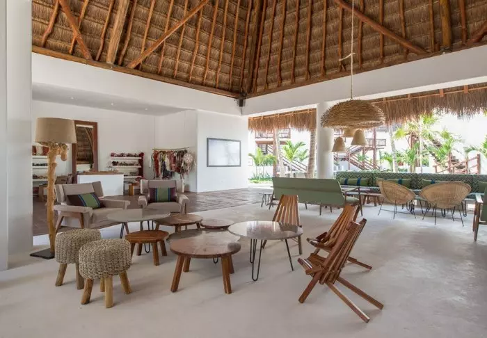 Både hotellets resepsjon og restaurant er bygget under en høy, stråtekket palapa, som er en tradisjonell meksikansk byggestil der naturlige materialer som tre, bambus og tørkede palmeblader brukes. I tillegg til å være veldig vakker, gir de åpne sidene og det luftige taket god ventilasjon, noe som gjør dem ideelle i varme og fuktige klima.