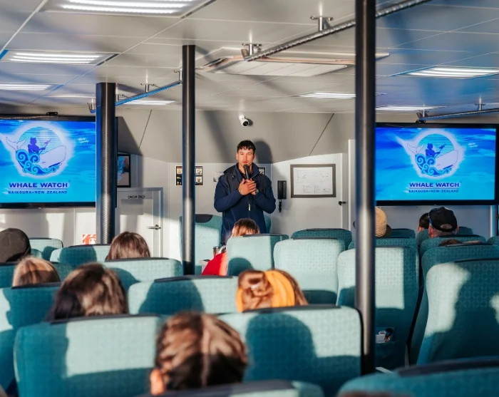 Når du har parkert bilen og sjekket inn hos Whale Watch Kaikoura (minst 30 minutter før avgang), blir du fraktet med buss ned til South Bay Marina (ca. 10 minutter), hvor du går om bord i en moderne katamaran som er spesialbygd for hvalsafari. Her står kapteinen og mannskapet klare til å gi deg de beste mulighetene for å se hvaler og andre havdyr og -fugler.