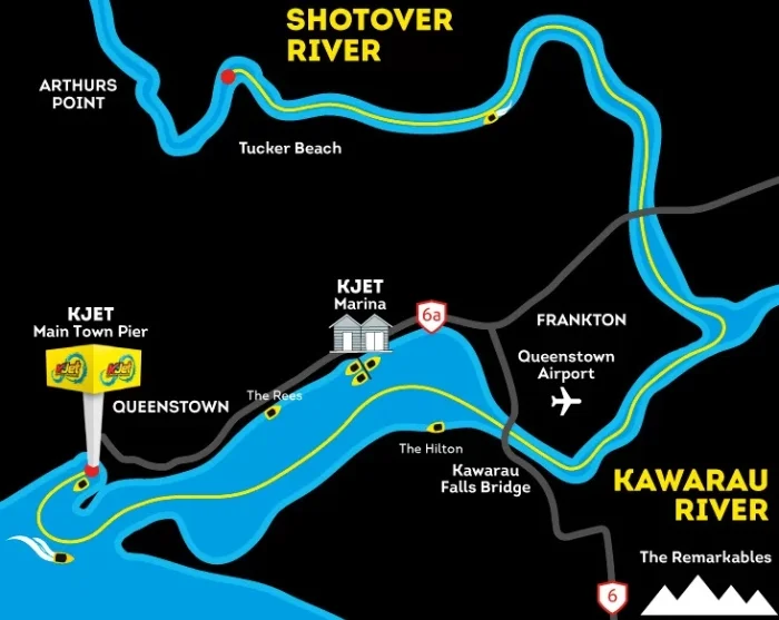 Turen starter ved Queenstown Pier, hvor du går om bord i en kraftig jetbåt. Gjør deg klar for én times eventyr over Wakatipu-sjøen og nedover Kawarau- og Shotover-elvene. Underveis når båten hastigheter på opptil 95 km/t, og du får kjenne på ville 360°-spinn og presise manøvrer gjennom grunne partier der det ofte bare er noen få centimeter med vann under båten. Dette er en teknisk bragd og en sanseopplevelse på én gang – vi garanterer sommerfugler i magen, brede smil og, ja, du blir nok ganske sikkert litt våt underveis.