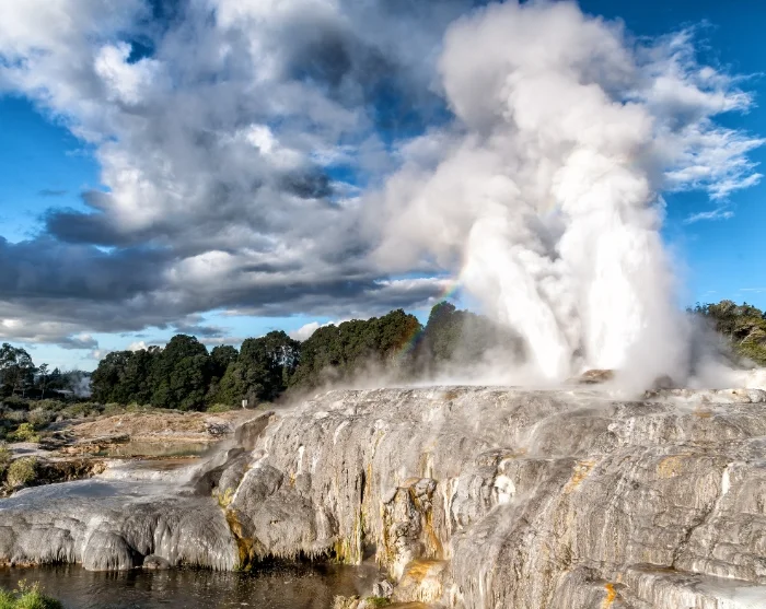 Du blir hentet på hotellet ditt i Rotorua, og første stopp på reisen er Te Puia Thermal Park. Her kan du oppleve boblende gjørme og dramatiske geysirer, blant annet Pōhutu-geyseren, som skyter opptil 30 meter til værs flere ganger om dagen.