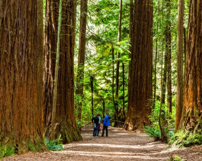 Redwood Forest er full av imponerende californiske redwoodtrær (Sequoia sempervirens), som ble plantet tidlig på 1900-tallet som ledd i et eksperiment. Nå er noen av trærne over 70 meter høye og mer enn 100 år gamle. Det er en helt spesiell opplevelse å vandre blant disse kjempene.