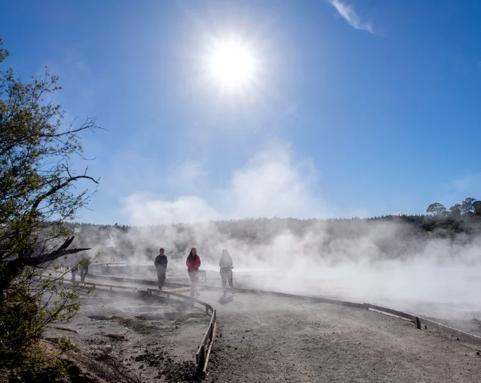 Ved ankomst starter du din selvguidede rundtur i parken, som tar omtrent 1–1,5 time. Du møtes av et landskap fullt av dampende svovelkilder, boblende gjørmepytter og kokende fossefall – alt omgitt av svovellukt, varme damptepper og krystalliserte mineralavsetninger. Ruten er tydelig merket og lett å gå, og underveis finner du informasjonstavler og utsiktspunkter som forklarer områdets unike geologi og maorienes betydning.