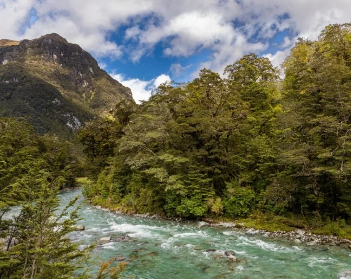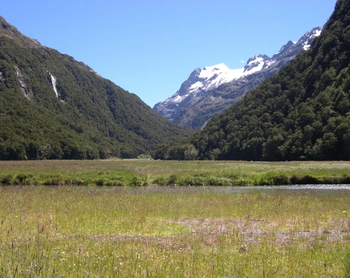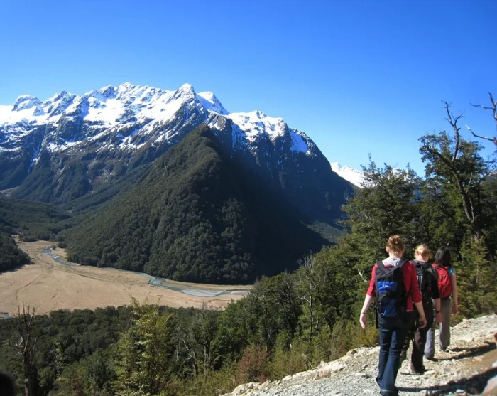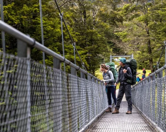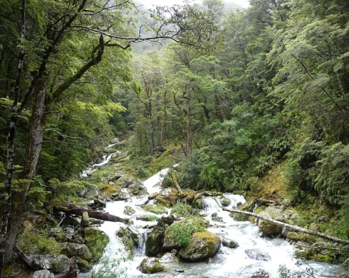 Du begynner med å krysse en hengebro over Routeburn-elven og vandrer inn i en spektakulær bøkeskog. Stien er jevn og lettgått, så du har gode muligheter til å holde øye med fugler som smetter mellom trekronene. Kanskje er du heldig og får øye på New Zealands minste fugl, klatresmutten (Acanthisitta chloris), eller den sjeldne gulhodede mohua (Mohoua ochrocephala), som bare finnes i New Zealand.