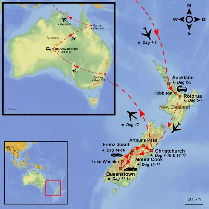 Eventyret begynner i New Zealand med maorikultur, geotermiske underverk, fjellsjøer og isbreer, og fortsetter i Australia med Sydney og den røde outbacken ved Uluru, før det avsluttes i tropiske Cairns.