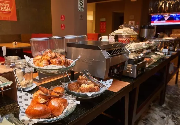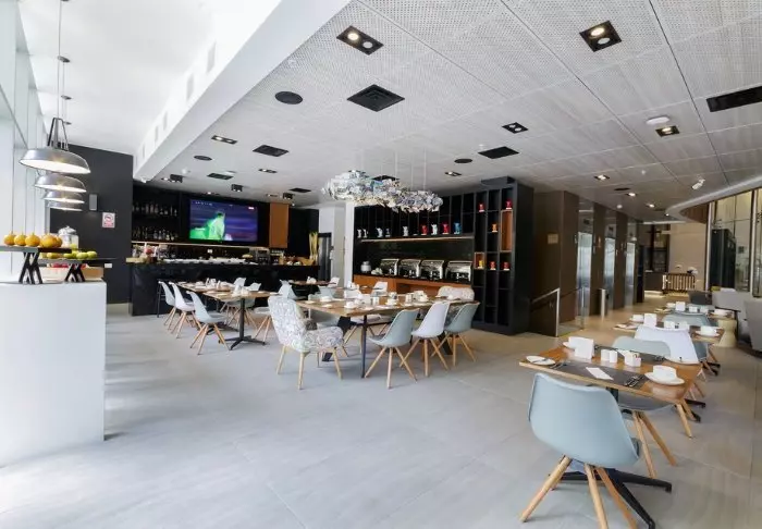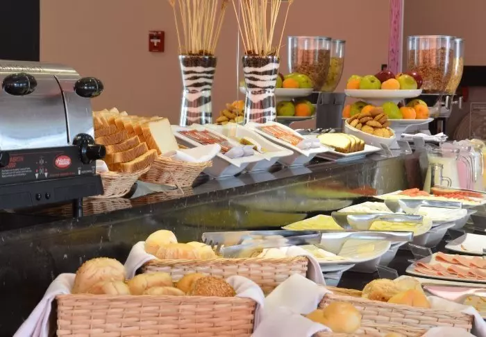På hotellets restaurant kan du starte dagen med den inkluderte frokostbuffeten. Her kan du velge mellom forskjellige frokostprodukter som brød, ost, skinke, juice mm.