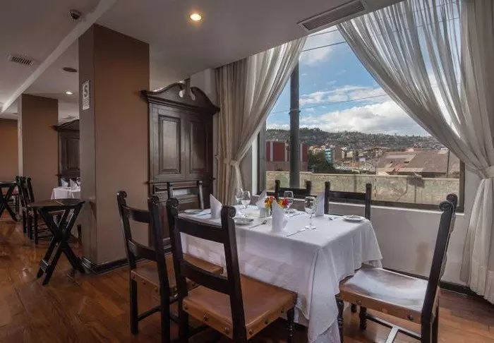 Den inkluderte frokosten serveres som buffet på hotellets restaurant Taypicamaña, som ligger ut mot byens torg.