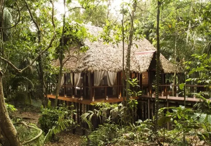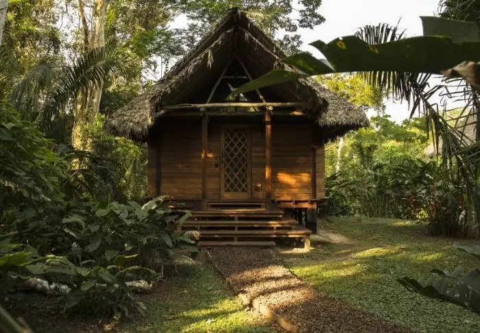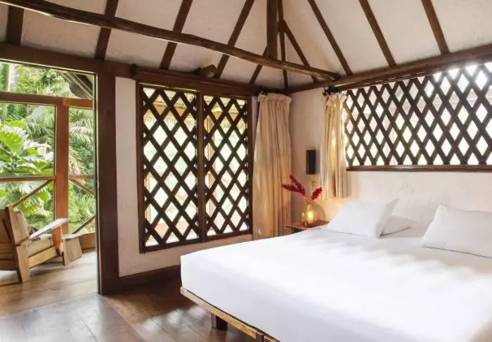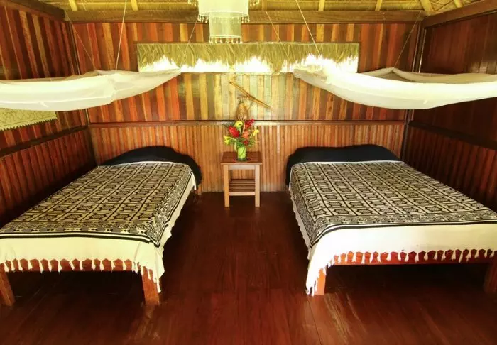 Her er det bare 25 vakkert innredede bungalower – alle bygget i tre og på pæler – så de ikke blir oversvømmet når det kommer kraftige tropiske regnskyll. Hyttene har komfortable senger med myggnett, takvifte og eget bad med varmt vann, badekåpe og toalettartikler.