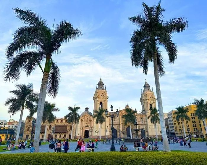 Du blir hentet på hotellet, og spaserturen går først til byens livlige sentrale torg, Plaza Mayor. Torget er vakkert dekorert med røde, hvite og gule blomster, høye palmer og en fontene med byens skytsengel på toppen. Torget er omgitt av vakre bygninger fra kolonitiden, som regjeringspalasset, erkebiskopens palass og Limas imponerende katedral, der Pizarros jordiske levninger er stedt til hvile.