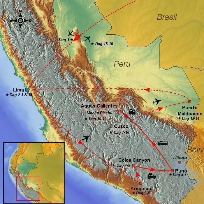 Peru er et utrolig vakkert og spennende land. Denne reisen tar deg med på et eventyr du sent vil glemme. Du kan glede deg til å oppleve byene Lima og Arequipa, som begge er kjent for sine vakre bygninger fra kolonitiden. Omgitt av imponerende vulkaner finner du den dype dalen Colca Canyon, med sjarmerende landsbyer, eldgamle landbruksterrasser og et rikt dyreliv med både lamaer, alpakkaer og kondorer. Ved den høytliggende Titicacasjøen får du et unikt innblikk i de opprinnelige folks kultur og dagligliv. Du besøker Inkari-kets gamle hovedstad Cusco, beundrer mesterlig steinhuggerkunst, utforsker Den hellige dal med sine imponerende terrassesystemer, små landsbyer og fargerike markeder, samt det berømte Machu Picchu – et av verdens nye underverker. Reisen avsluttes i den frodige Amazonas-regnskogen, hvor fargesprakende sommerfugler, frosker, papegøyer, aper og mengder av grønne planter venter deg.