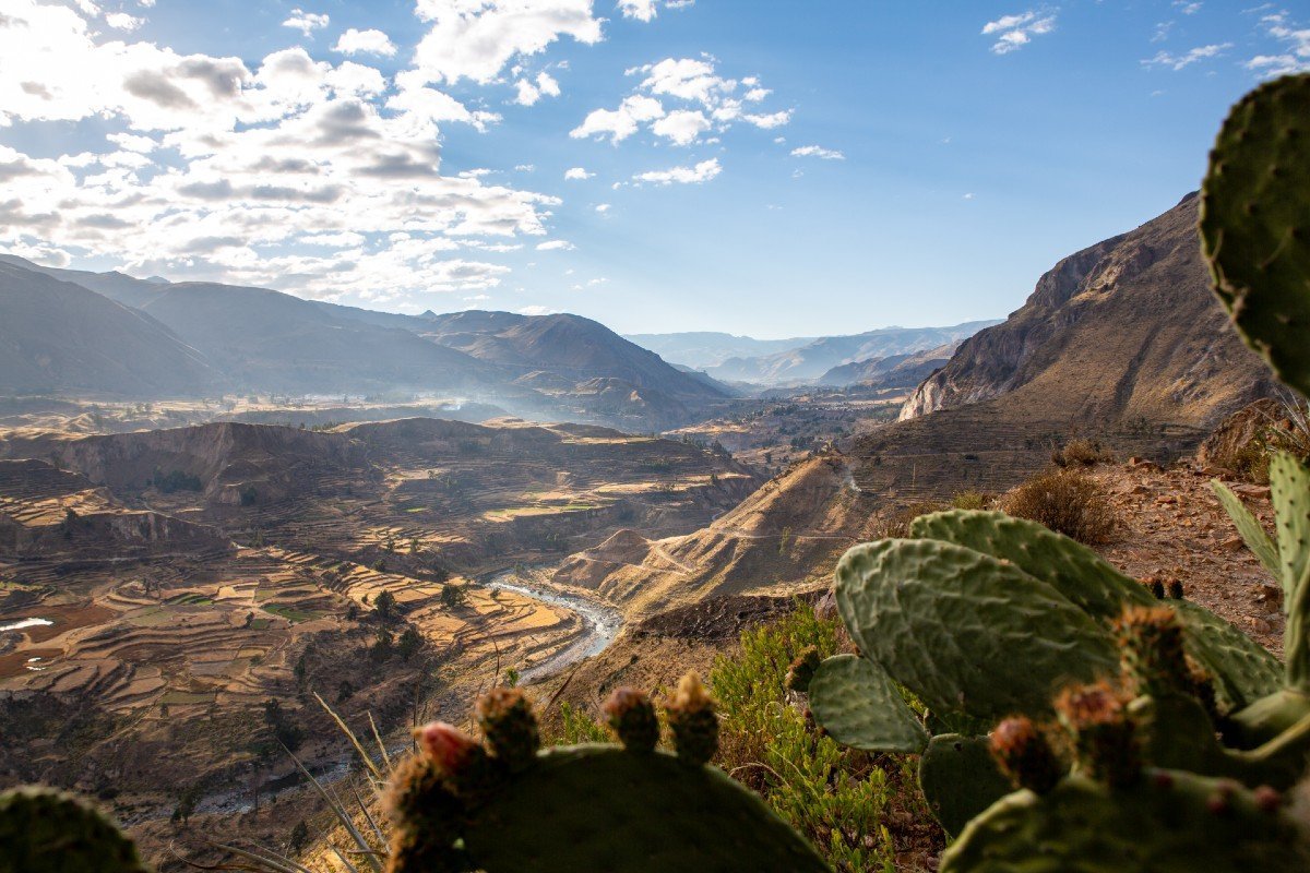 De neste par dagene får du virkelig oppleve de mektige Andesfjellene. Du krysser den spektakulære høysletten Altiplano. Den er kjent for sitt tørre, golde landskap med store åpne vidder der du kan få øye på beitende lamaer og alpakkaer. Flere steder kjører du i over 4 000 meters høyde. Det høyeste passet og utsiktspunktet på ruten heter Mirador de los volcanes, og herfra har du i klart vær en fantastisk utsikt til de omliggende vulkanene. Utsiktspunktet ligger i ca. 4 900 meters høvde, og du vil nok raskt merke at den tynne luften i denne høyden gjør det mer anstrengende å puste. Derfor blir det også bare et raskt fotostopp før du fortsetter ned mot byen Chivay, som fungerer som inngang til Colca Canyon.