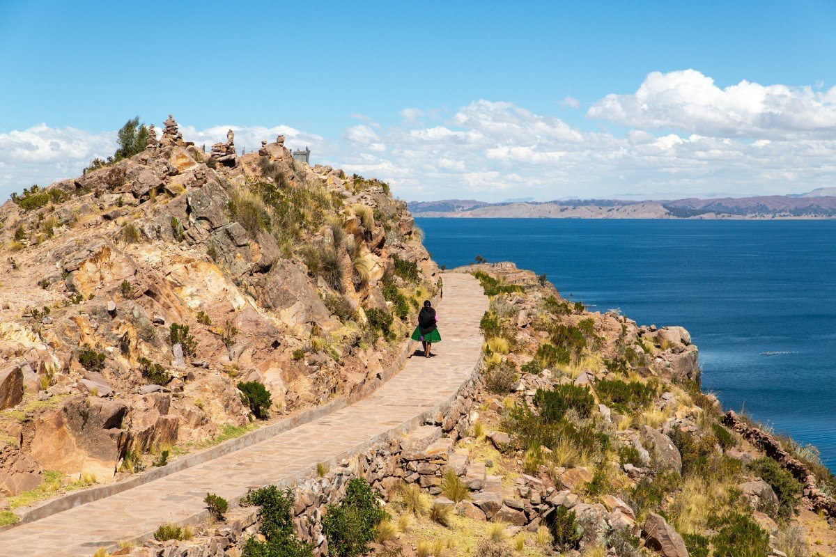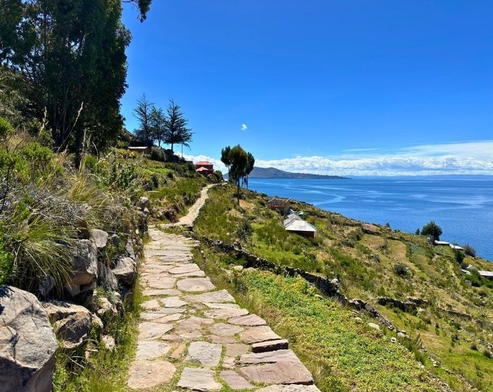 Du spiser lunsj på den vakre, kuperte øya, og deretter tar guiden deg med på en tur til fots, opp til øyas høyeste punkt. Her er det flott utsikt over Titicacasjøen, med høye fjell i bakgrunnen.