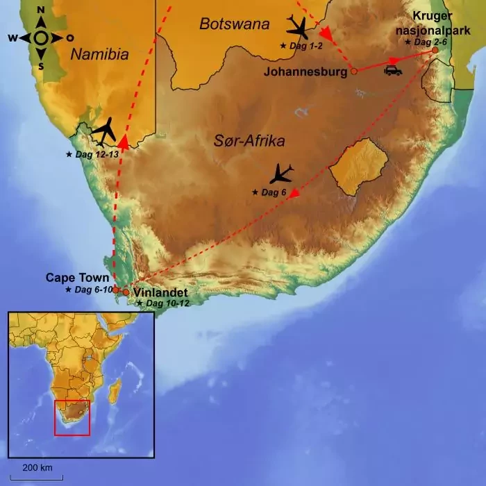 Ved ankomst i Johannesburg blir du hentet på flyplassen og kjørt til campen ved Kruger nasjonalpark der du skal tilbringe de neste fire nettene. Parken strekker seg 350 km fra sør til nord og ca. 65 km fra øst til vest, og er dermed en av verdens største nasjonalparker.