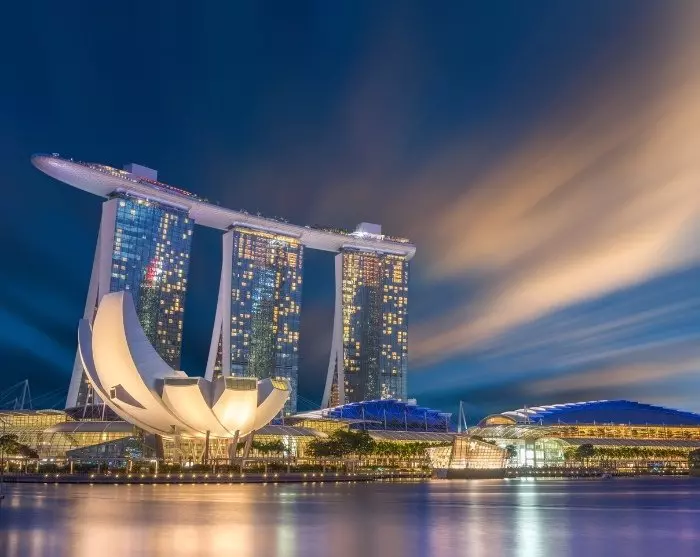 Kvelden avsluttes ved vannkanten, der du kan beundre det fascinerende lys- og vannshowet på Marina Bay Sands – en uforglemmelig opplevelse som viser frem Singapores teknologiske innovasjon og kreativitet.