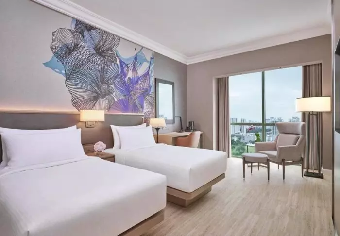 Hotellets atmosfære kombinerer eleganse og komfort, noe som også gjenspeiles på hotellets 386 rom. Alle rom er stilfullt og komfortabelt innredet og har utsikt til Singapores imponerende skyline. Rommene er min. 32 m2 store, og de har alt det du trenger for å få et behagelig opphold, bl.a. Wi-Fi, aircondition, safe, minibar, kaffe- og tefasiliteter samt strykejern og -brett. Badet er også romslig, og her finner du dusj eller badekar samt toalettartikler og hårtørker.