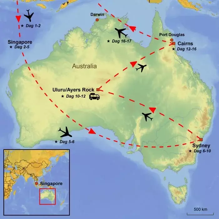 Gled deg til et stopp i flotte Singapore før du fortsetter til Australias store kontraster. Down Under venter både Melbourne og Sydney og den røde ørkenen før du avslutter reisen i tropiske Cairns.