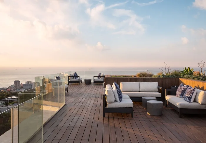 Hotellet ligger sentralt i byen, med gode restauranter i gangavstand, men det er bygget som en egen liten oase. I midten av hotellet er det en bakgård med basseng, terrasse, liggestoler, kafé – og som nevnt med flott utsikt mot fjellet, byens vartegn.
