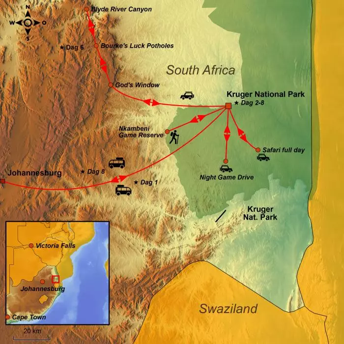 På denne reisen bor du på Kruger Gate Hotel, rett ved grensen til den verdensberømte Kruger nasjonalpark. Du har mulighet til å komme tett innpå The Big 5, og du lærer å tolke naturens tegn på en spennende bush walk med en flink ranger. Du opplever Sør-Afrikas høyeste og lengste fjellkjede, Drakensfjellene. Her er det en spektakulær utsikt over et av turens høydepunkter: Blyde River Canyon, verdens tredje største kløft. Du opplever også utsiktspunktene God’s Window og Bourke’s Luck Potholes, der elvene Blyde og Treur har gravd ut dype, sylindriske formasjoner i klippene.