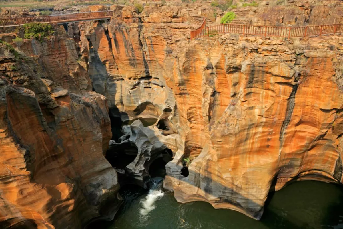 I dag skal du ut på en heldagstur med store naturopplevelser langs Panoramaruten i de dramatiske Drakensfjellene. Drakensfjellene er røde og danner en fantastisk kontrast til de grønne trærne og plantene. Du kan beundre Blyde River Canyon, en nesten 700 m dyp og 60 km lang kløft, verdens tredje største. Du stopper ved de tre viktigste utsiktspunktene langs kløften: God’s Window, Bourke’s Luck Potholes og de tre rondavellene. Rondavellene er 3 vakre og markante klippeformasjoner som ligner på de runde hyttene man tidligere fant i lokale landsbyer mange steder i det sørlige Afrika. Der er også mange fosser på panoramaruten, og du skal stoppe ved ett av dem. Det kan være Berlin Falls, der vannet faller 150 meter ned i en sjø. Eller kanskje det blir Lisbon Falls, fossen som ligger de Blyde River deler seg i to og deretter faller 92 m ned over en nesten loddrett klippe og igjen samles til ett elveløp. Det er også mange andre fosser, og guiden bestemmer hvor dere skal stoppe. Et av dagens mest spektakulære opplevelse blir helt klart Bourke’s Luck Potholes, sylindriske hull slitt gjennom klippene av vann og sant gjennom mange tusen år. Du kommer nær innpå dette naturfenomenet på broene som er bygd over disse helt spesielle hullene.