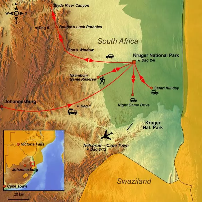 Du bor få meter fra porten til Kruger nasjonalpark og kommer tett innpå The Big 5 på safari inne i parken. Bli med på en spennende bush walk med en ranger, se Panoramaruten og avslutt reisen i vakre Cape Town.