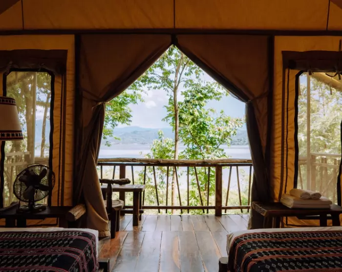 Ved bredden av den speilblanke innsjøen Lak Lake i Vietnam ligger Lak Tented Camp. Omgitt av frodige grønne fjell, tett skog og tradisjonelle landsbyer, er campen skapt med fokus på ansvarlig turisme og bærekraft.