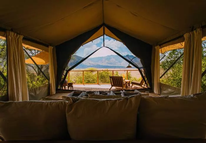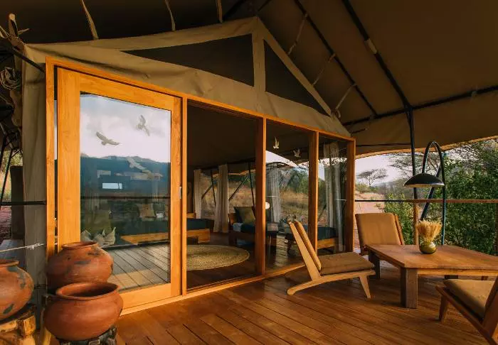 Teltleiren består av syv luksustelt, som alle ligger på sin egen platting med balkong, og utrolig utsikt over Dindira-sletten. Teltene er store og romslige og svært godt utstyrt. De har et eget bad – som imidlertid er best egnet for par som reiser sammen – og veldig komfortable senger.