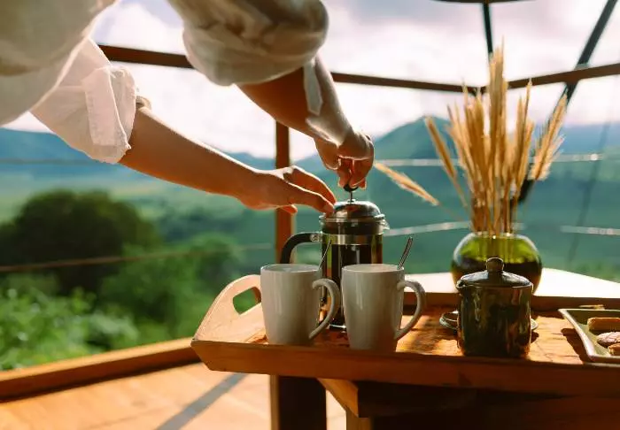 Om morgenen serveres nylaget kaffe på balkongen, slik at du kan ta deg tid til å nyte soloppgangen før du tar turen til restauranten, der det dukes opp med en herlig frokost.