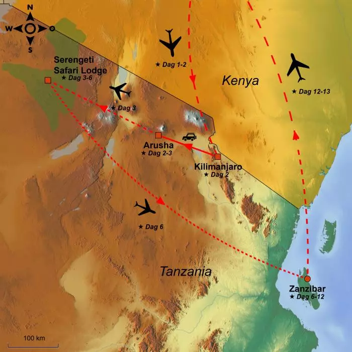 Hvis du er heldig, kan du fra luften få et glimt av Afrikas høyeste fjell, Kilimanjaro. Det reiser seg majestetisk hele 4 800 meter opp fra savannen (5 895 moh.), og fjellet har alltid snø på toppen.