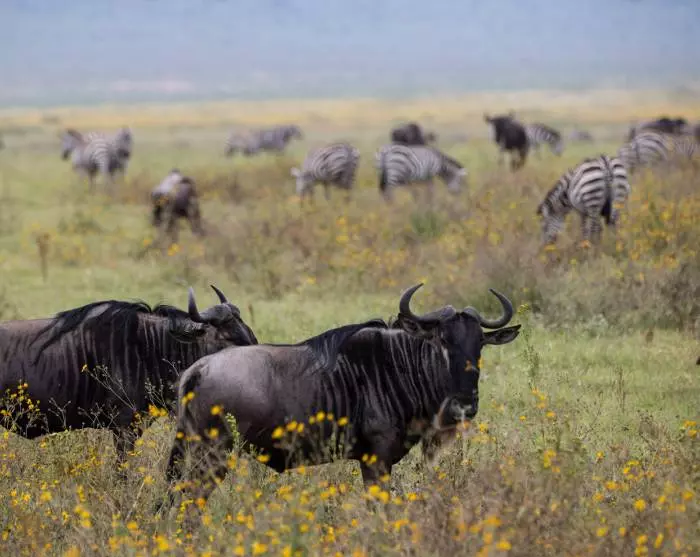 Den eneste arten av de klassiske safaridyrene du ikke finner her, er giraffen. På vei nedover i krateret kan du tenke over hva dette skyldes. Utenom det kan du finne alle slags safaridyr her – og masse av dem! Elefanter, sebraer, gnu, bøfler, løver, flamingoer, flodhester, antiloper, stork, hyener, sjakaler – ja, hvis du er heldig, kan du til og med se de kritisk truede svarte neshornene.
