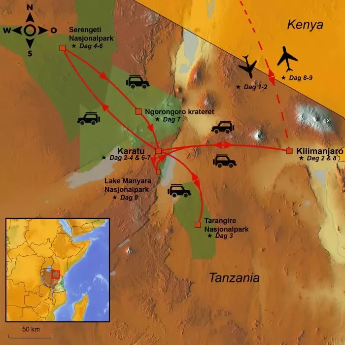| Dag 8 | Lake Manyara ca. 25 km og til Kilimanjaro Airport ca. 170 km | 195 |