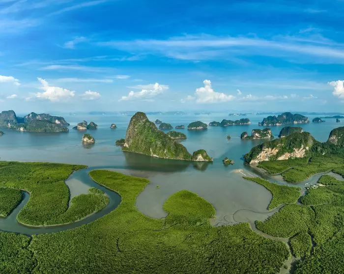 Dagen i dag tilbringes i den vakre bukten Phang Nga. Den ligger mellom Phuket og Thailands fastland. Det er en av de vakreste buktene i hele Thailand. Kalksteinsklipper rager loddrett opp av det klare, blågrønne havet. Noen steder er de helt bare, andre steder er de overgrodd av busker og trær. På klippene bor det både aper, varaner og massevis av fugler.