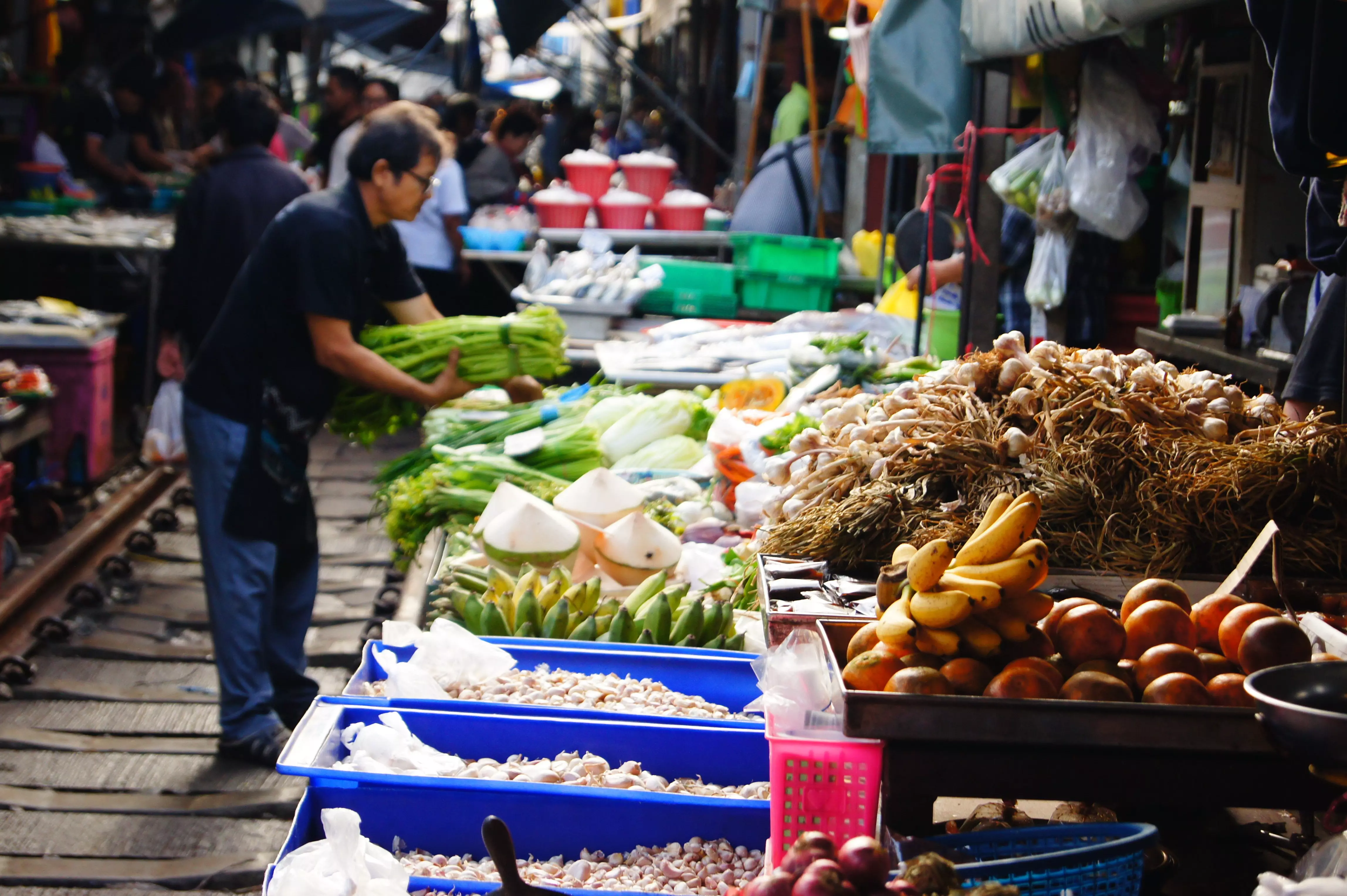 Etter litt over en times kjøring kommer du frem til Maeklong, hvor du får oppleve et travelt marked der det selges frisk frukt, grønnsaker, krydder, kjøtt, fisk og suvenirer – og mye mer. Det mest fascinerende med markedet er at det delvis går langs et jernbanespor. Når et tog sakte nærmer seg, blir du henvist bak de røde linjene for å sikre at du står i trygg avstand. Markedsselgerne har utviklet en effektiv metode for å pakke sammen markisene og varene raskt og koordinert for å gi plass til toget – og det er et herlig syn. Hvis det blir tid til det, kan du ta turen ned til Maeklong stasjon, der toget stopper til det har avgang i motsatt retning. Et steinkast unna jernbanestasjonen (og turistene) finner du små, sjarmerende boder der du kan kjøpe en iskaffe, thailandsk te eller den tradisjonelle thailandske desserten «khanom krok».