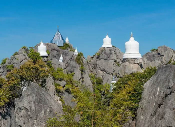 Du kommer til en parkeringsplass der en shuttlebuss kjører deg det siste stykket opp fjellet. Her fører 500 trinn til toppen av et av Thailands flotteste utsiktspunkter. Turen opp er anstrengende, men når først du står på toppen, belønnes du med en ubeskrivelig panoramautsikt over landsbyene, Thung Thung-dalen og ikke minst tempelets hvite pagoder som hviler på skyhøye fjelltinder – et helt fantastisk syn! Guiden forteller deg historien om det religiøse byggverket, som faktisk bare er noen få år gammelt, og du har god tid til å oppleve stedet og det imponerende arbeidet.