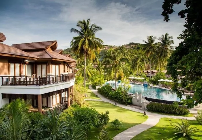 Foran frodige fjell og mellom vaiende kokospalmer finner du Outrigger Khao Lak Beach Resort, som ligger helt nede vedl Bangsak-stranden med utsikt over Andamanhavet.