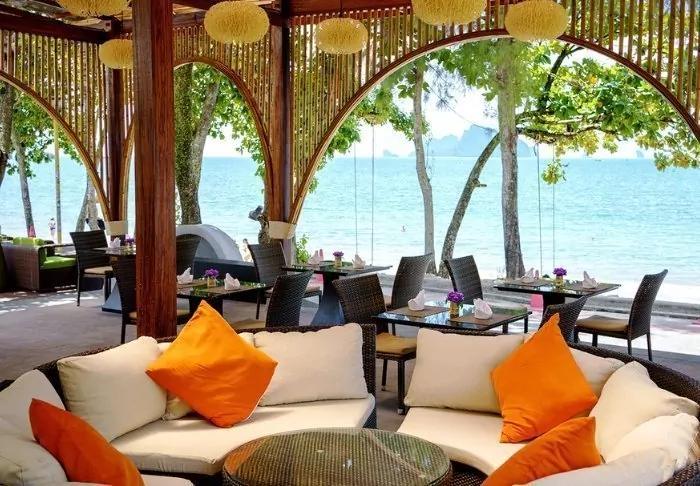 Stranden ligger bare et steinkast unna, og her kan du se de mange longtail-båtene som går i skyttelfart mellom Aonang og Railey. Fra stranden er det flott utsikt over Andamanhavet og de loddrette kalksteinsfjellene.