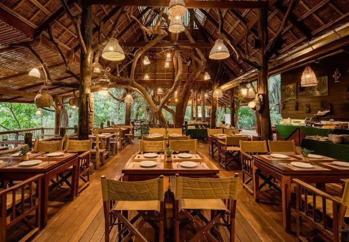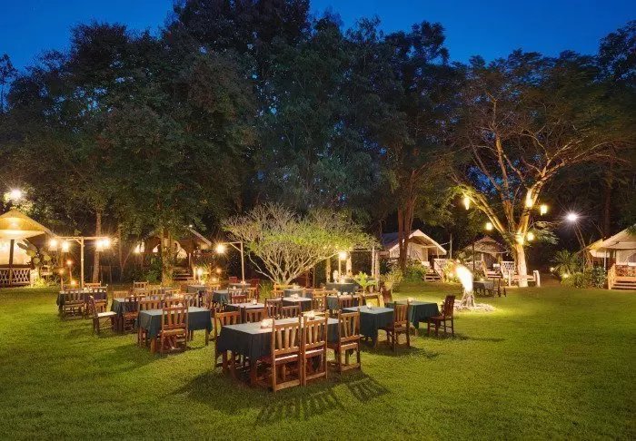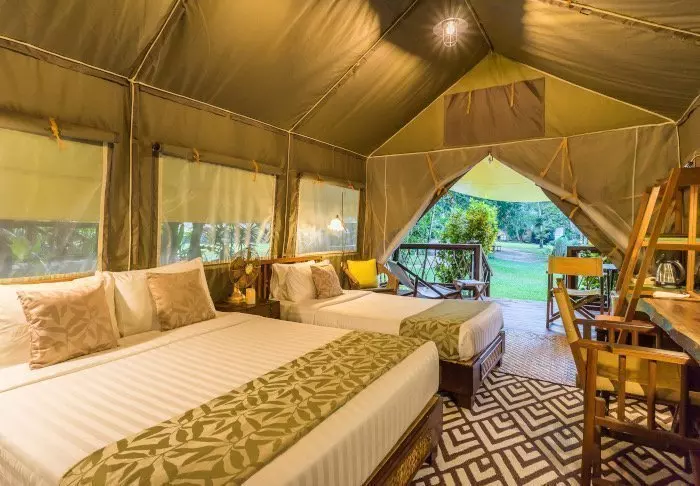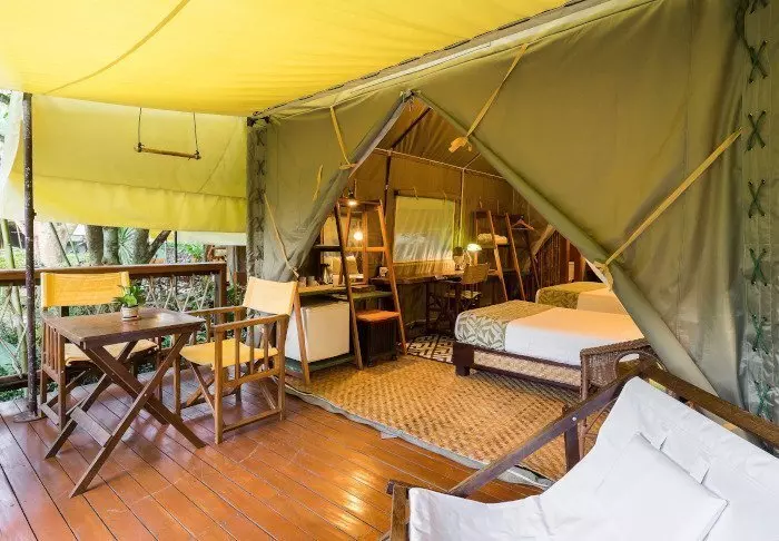 Leiren består av 38 luksuriøse lerretstelt på mellom 26 og 32 m² som er hevet en halv meter over bakken. Teltet har ordentlige senger, eget bad med varmt vann, hårtørker og toalettartikler samt egen veranda. Der kan du nyte stillheten og de frodige omgivelsene. Samtlige telt har dessuten Wi-Fi, aircondition, toalettbord/skrivebord, gratis mineralvann på flaske, kjøleskap og elektrisk kjele til te og kaffe. Etter klokken 22 skal det være stille i leiren – altså ingen høy musikk, kun jungelens lyder.