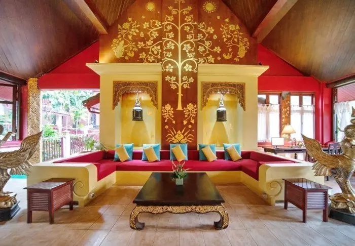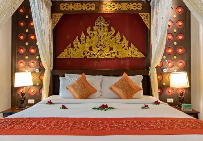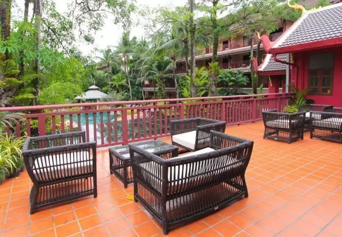 Rommene er også innredet i thai-stil med vakre treutskjæringer og flotte mønstrer på puter og tepper. Her er det TV, kaffe- og tefasiliteter, aircondition, safe, minibar, hårtørker – og en paraply, hvis det skulle komme et tropisk regnskyll. Alle rom har egen balkong.